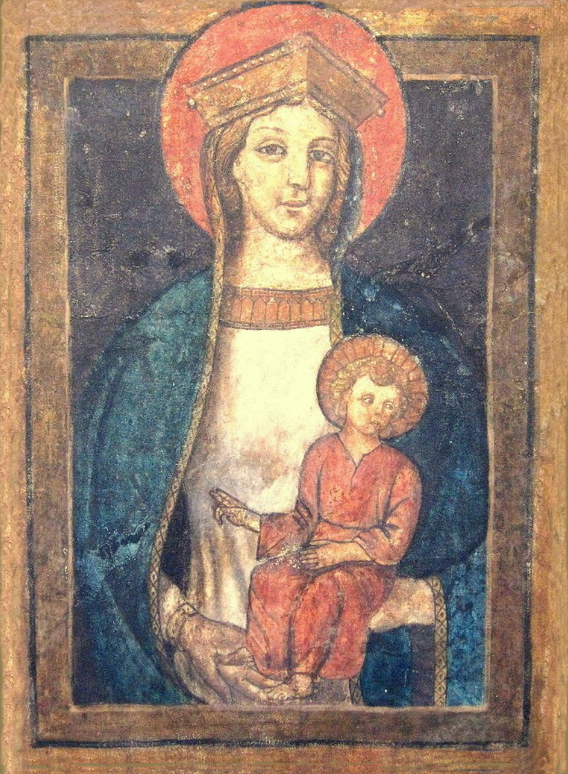 La Madonna improntata ad una corposità materna e solenne rimanda uno sguardo accogliente e profondo. Indossa un copricapo regale che anziché a forma circolare si presenta mitrato.